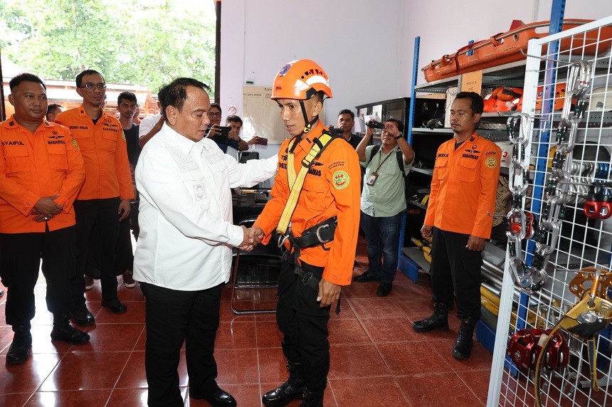Setelah dari kantor BMKG dilanjutkan dengan kunjungan ke Kantor Basarnas Kendari. Andap diterima oleh Plh Ka Basarnas Kendari. Disana, Pj Gubernur selanjutnya mengecek kesiapan dan kecepatan personel Basarnas untuk memakai alat perlengkapan SAR.