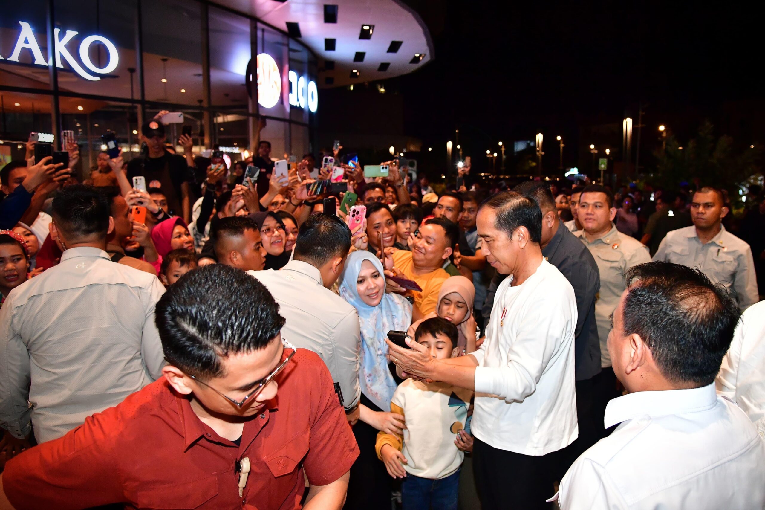Presiden Joko Widodo menyapa warga Kota Kendari, Provinsi Sulawesi Tenggara di pusat perbelanjaan The Park pada Minggu malam, 12 Mei 2024. Presiden Jokowi, yang tiba sekitar pukul 19.00 Wita, mengejutkan banyak pengunjung yang sedang menikmati waktu mereka di pusat perbelanjaan tersebut.