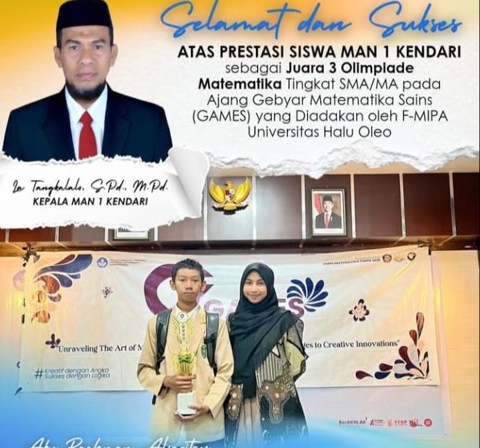 Siswa-siswi Madrasah Aliyah Negeri (MAN) 1 Kendari terus menorehkan prestasi. Setelah siswinya yaitu Aliyah Qonita memenangi kontes robot Internasional se-Asia Tengggara beberapa waktu silam, giliran seorang siswa bernama Abu Rachman Alfaritzy meraih prestasi sebagai juara tiga dalam ajang Gebyar Matematika Sains (GAMES). Kegiatan ini digelar Fakultas Matematika dan Ilmu Pengetahuan Alam (F-MIPA) Universitas Haluoleo, Kendari.