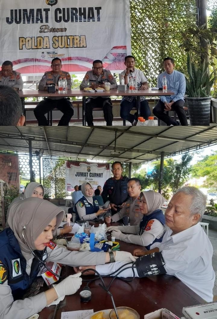 Kegiatan Jumat Curhat yang rutin dilaksanakan pihak Kepolisian Daerah (Polda) Sultra setiap pekannya, ikut menghadirkan pemeriksaan kesehatan gratis. Kegiatan ini berlangsung di kafe Ana Wonua Kota Kendari, Jumat (12/12) dihadiri sejumlah pejabat utama Polda Sultra dan warga dari perumahan BTN Magaga dan BTN Wikafuri.